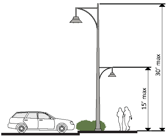 Light fixtures within pedestrian areas may be no higher than 15 feet.