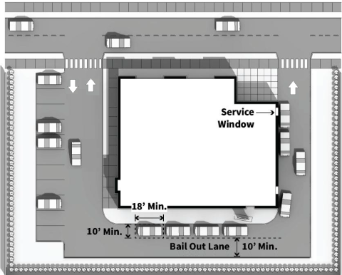 If a bail out lane is provided, it must be a minimum width of ten feet in width and run parallel to the drive through lane. If such bail out lane is also an interior access drive providing access to parking spaces, the bail out lane is limited to a one-way traffic pattern following the direction of the drive through lane.