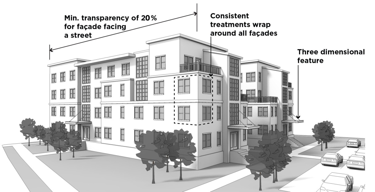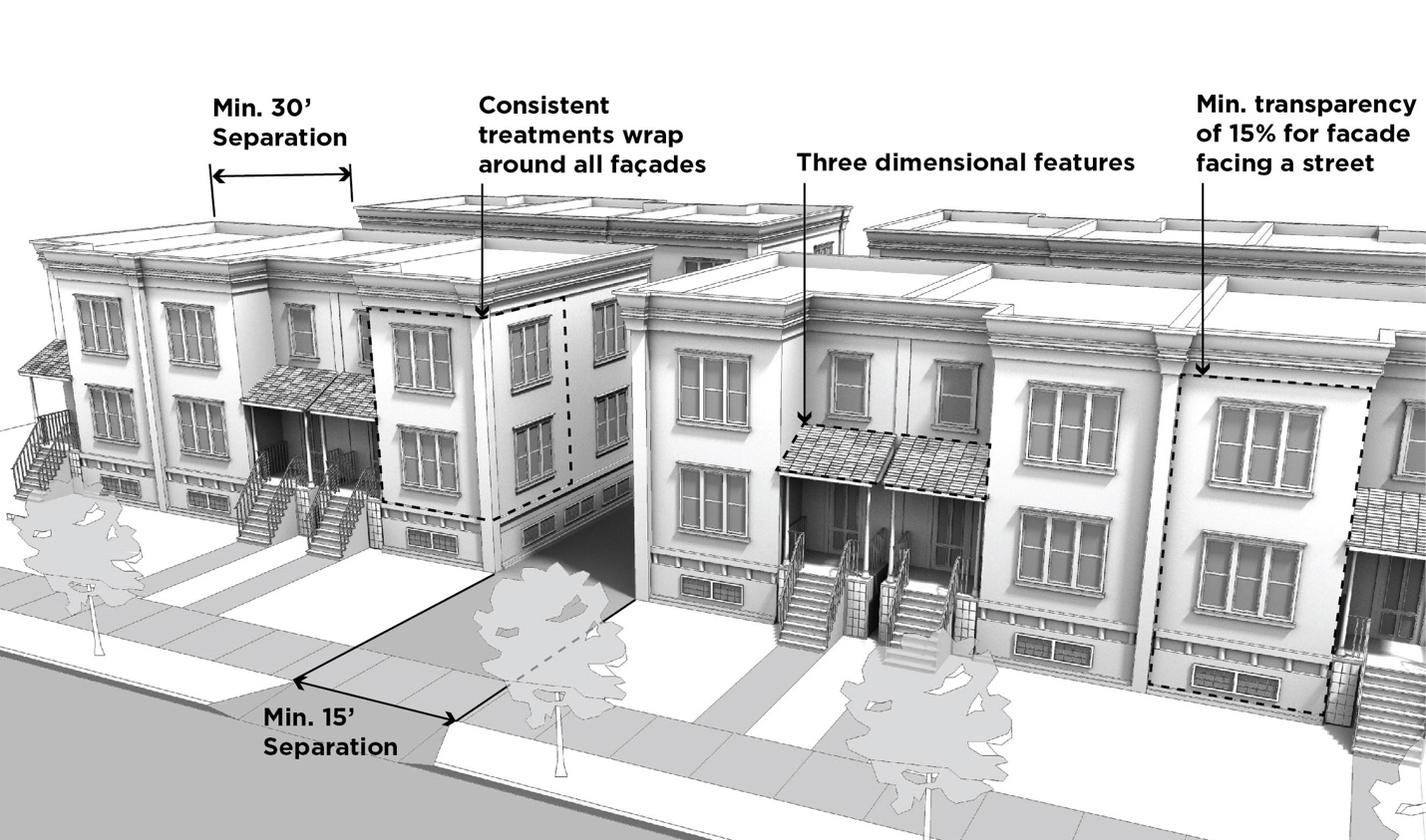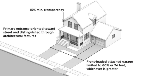 No required off-street parking is allowed in front of the front building facade. All required off-street parking spaces must be screened by landscaping or other suitable opaque barrier from adjacent residences. All off-street parking areas require a Class A buffer yard per Section 12.8.