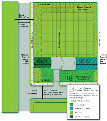 Front and streetside yard setbacks for accessory structures are the same as the minimum front and streetside setbacks for the principal structure.