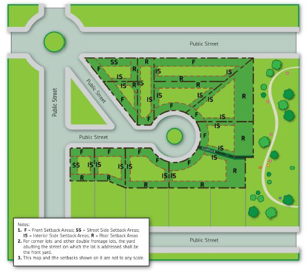 | Principal Building to Front and Street Side Lot Lines (a) | Principal Building to Interior Side Lot Line | Principal Building to Rear Lot Line | Accessory Building to Interior Side/Rear Lot Line (a),(d) | Hard or Gravel Surface (c) | Principal Buildings | Accessory Buildings | ||||