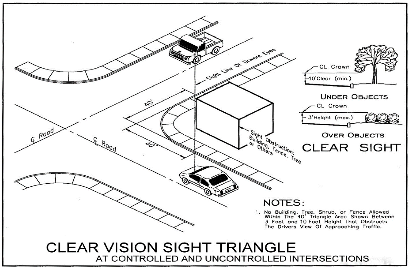 Clear vision sight triangle diagram: The city has adopted the following clear vision triangle exhibit for both controlled and uncontrolled intersections. The term clear vision triangle has the same meaning as the phrase clear sight triangle: