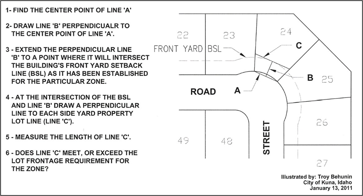 When a lot's side property boundaries are not parallel or the lot has an odd configuration that casts doubt on its capacity to meet the city's lot width requirements for a given zone - city staff will measure the lot width at the front yard setback to determine whether it meets this requirement by way of the following process: