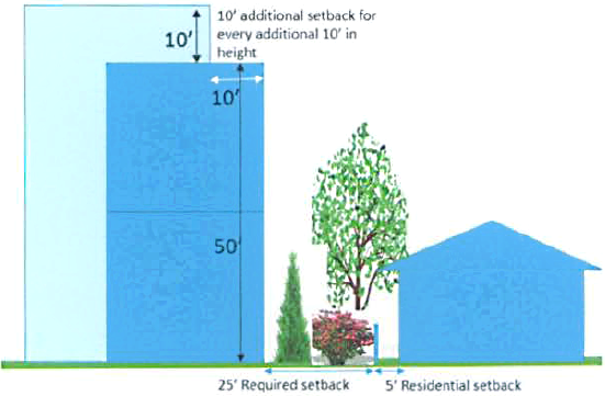 Height. Height of buildings shall be limited to 50 feet plus an additional ten feet of allowed height for every additional ten feet of setback provided from the nearest property line beyond the required setback in section 71-27; provided, however: (i) required residential landscaping and screening buffers shall not be treated as providing additional setback; and (ii) where landscaping and screening buffers are required due to adjacent residential uses or zoning districts, additional setbacks provided to increase allowed building height shall be measured from the nearest required screening or landscaping buffer inner edge. Height limitations shall not apply to decorative elements of buildings that do not include any air conditioned floorspace.