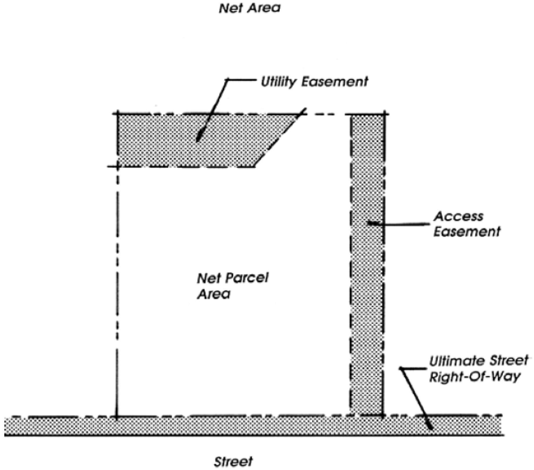 Area, net, means the area of a lot or parcel of land, less the area of existing or proposed public alleys, highways, streets or other necessary public easements, when included within a proposed development project. The term "net area" includes "net acreage."