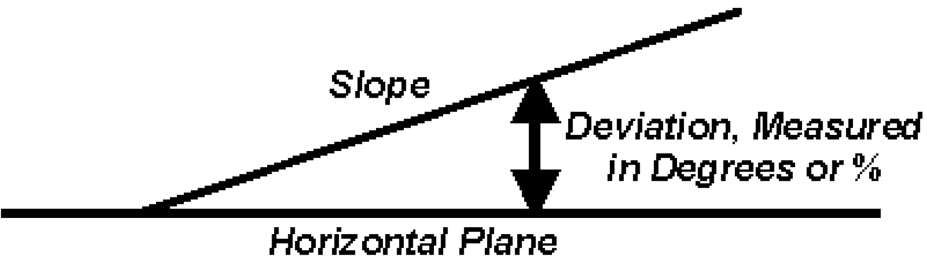 Slope means the degree of deviation of a surface from the horizontal plane, usually expressed in degrees, percentages, or as a ratio of feet of vertical change over a given horizontal distance (e.g., 4:12).