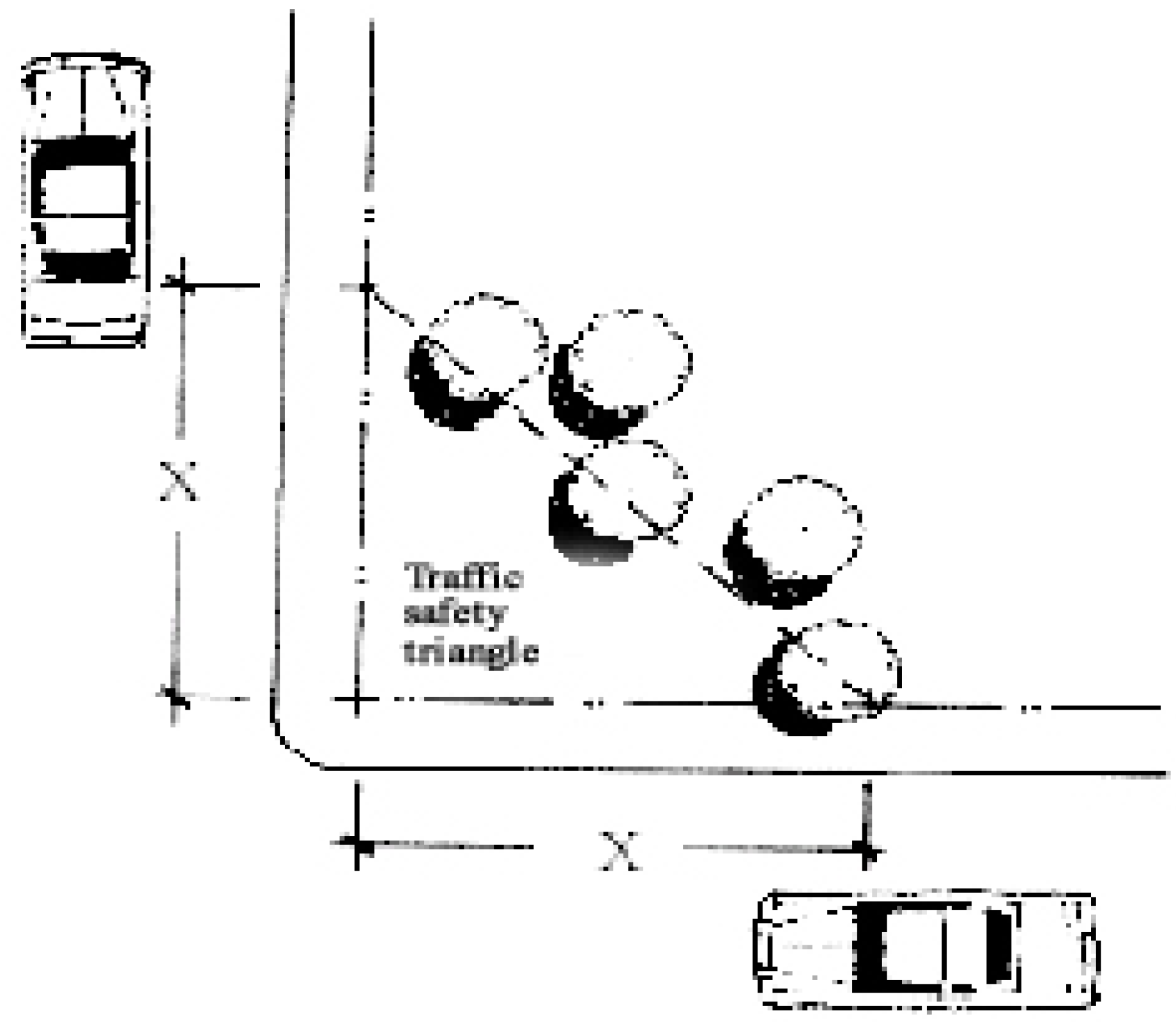 Traffic safety triangle means a space that is set aside on a street corner or driveway entrance in which all visual obstructions (e.g., structures and plantings) that can prevent visibility, and thus could be a hazard to traffic and pedestrian safety, are prohibited.