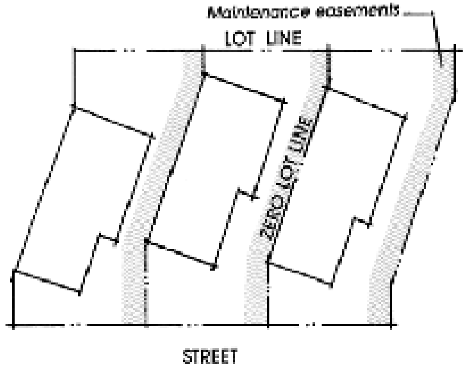 Zero lot line means the location of a structure on a parcel in which one or more of the structure's sides rest directly on a lot line and maintenance easements are provided.
