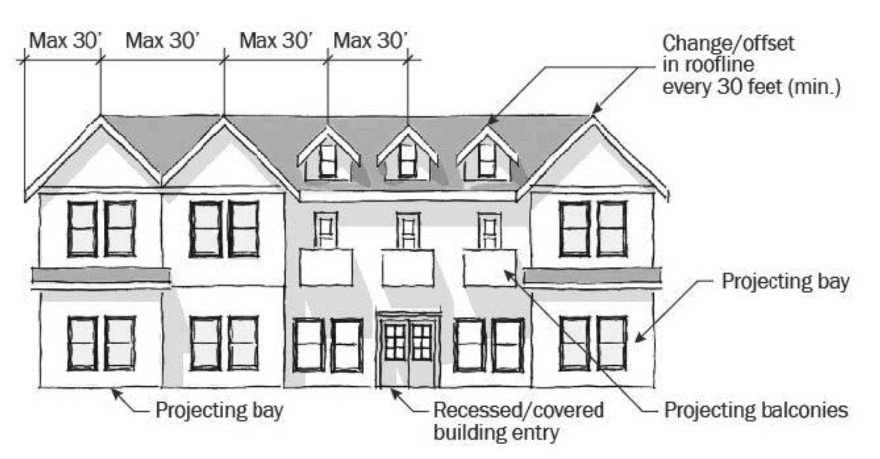 Articulation. Plans for multi-family structures shall incorporate design features such as varying rooflines, offsets, balconies, projections (e.g., overhangs, porches, or similar features), recessed or covered entrances, window reveals, or similar elements that break up otherwise long, uninterrupted elevations (see Figure 15.104-1). Such elements shall occur at a minimum interval of 30 feet, and each floor shall contain at least two elements from the following options: