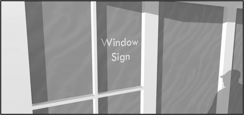 WINDOW SIGN — Any sign, poster, banner, sticker, cling, pictures, symbol, stencils, lettering, or combination thereof located in a window, as depicted in figure 13 below.