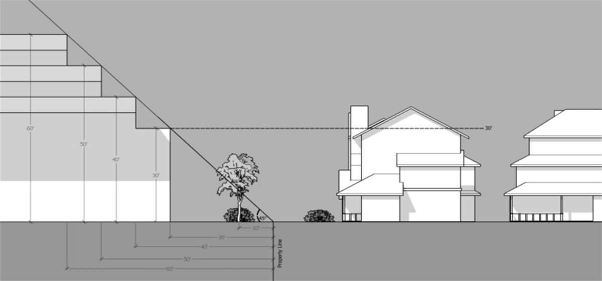 Multi-story commercial buildings shall incorporate lower roof heights for portions that are adjacent to residentially zoned properties that have lower roof heights.
