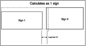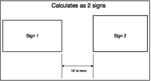 Signs less than one (1) foot apart are measured as one sign and space between the elements must be included in the calculation of the sign. Signs more than a foot apart, that are not two (2) sided (as defined below), are calculated as separate signs. these principles are depicted in figures 27 and 28.