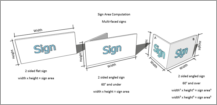 Signs with two (2) flat sides or with an angle less than sixty (60) degrees shall have one (1) of the two (2) sides count towards the total sign area, computed by multiplying the width by the height. Two (2) sided signs with an angle greater than sixty (60) degrees shall have the two (2) sides count towards the total sign area, computed by multiplying the width and height of each side. These principles are depicted in figure 29.