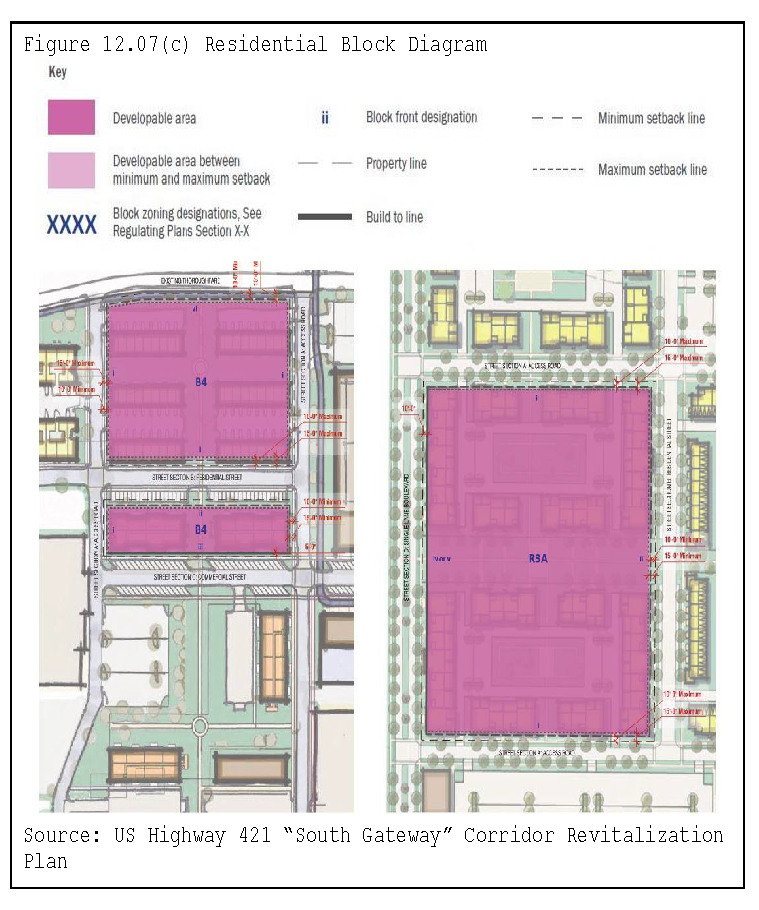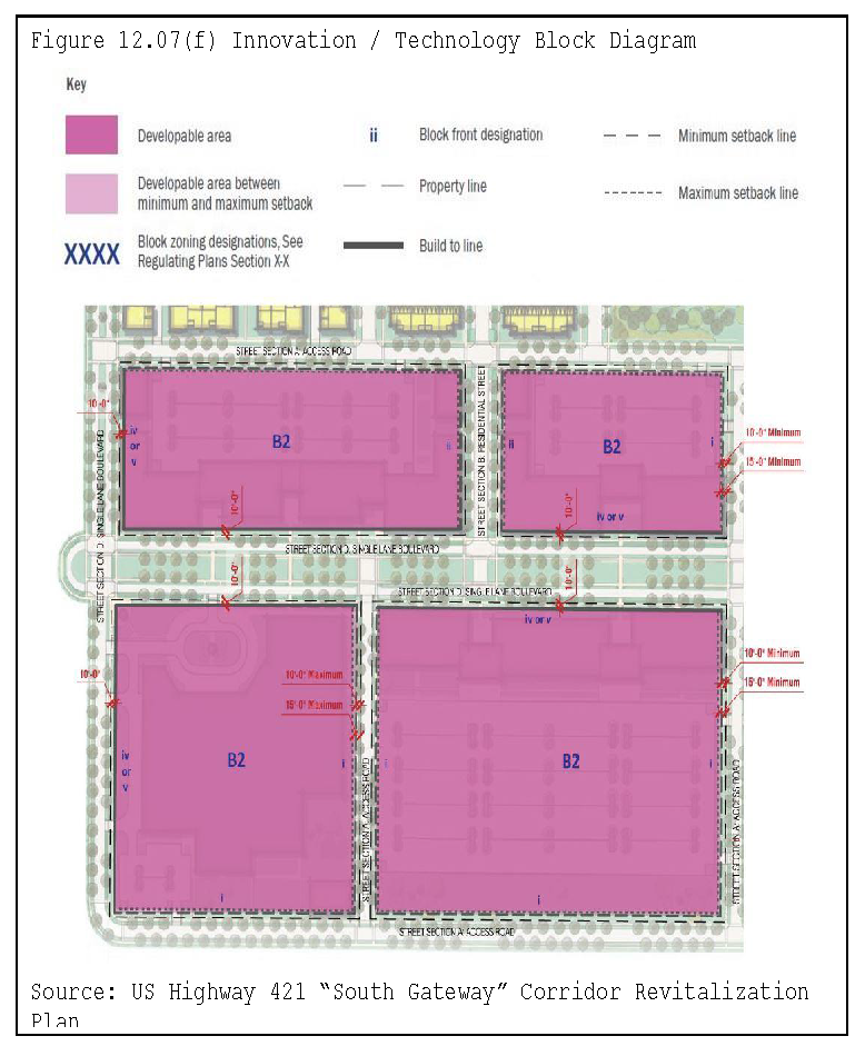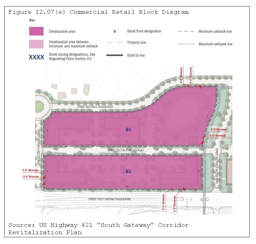 Preserve future right-of-way and minimize disruption of existing businesses and homes through preservation of additional right-of-way that may be necessary to widen the road. To achieve this, the overlay district provides for specific setbacks along the corridors.