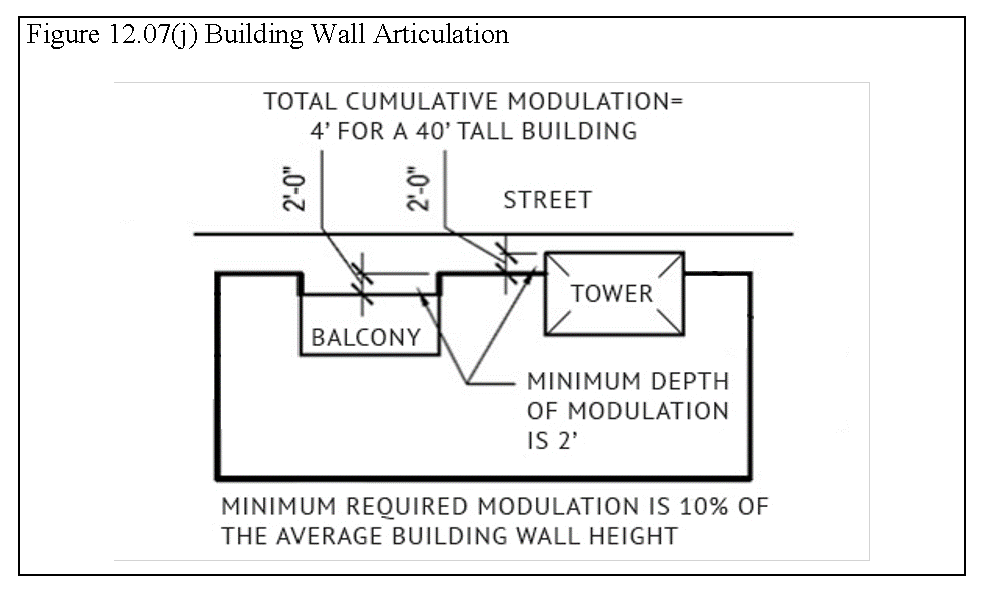 Articulation. Building facades along public or private streets, pedestrian areas, or common open spaces shall be articulated with projections or recesses that cumulatively equal 10 percent of the average building wall height, with a minimum depth of two feet. Such variations will contribute to the building architecture, which may be expressed in any manner provided the cumulative relief is achieved, as shown in Figure 12.07(j), Building Wall Articulation. Individual storefront designs and materials, as applicable, may be unique while maintaining the character of the building facade of which they are a part. The base of buildings must be articulated through use of plinths, pilasters, or other elements.