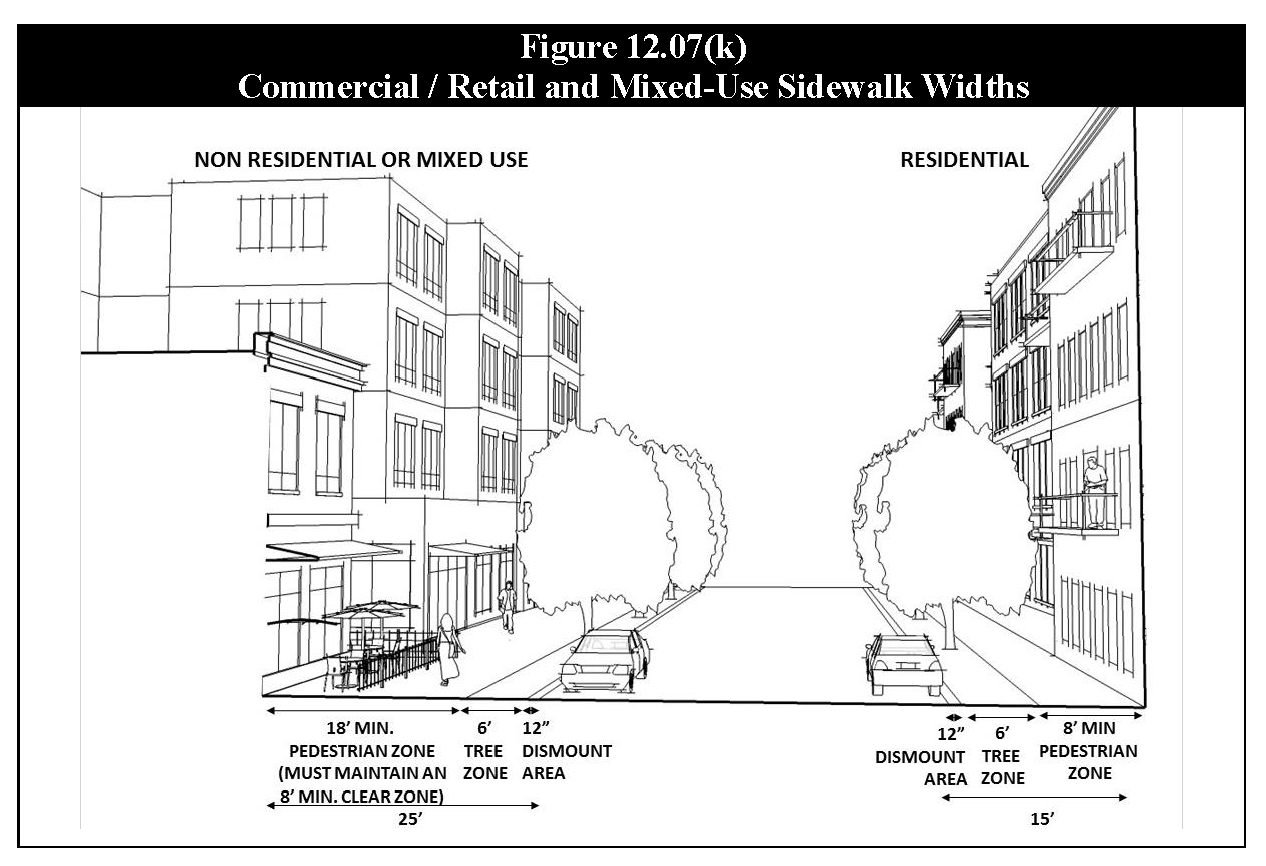 Sidewalk widths adjacent to public streets (see Figure 12.07(k), Commercial/Retail and Mixed-Use Sidewalk Widths) shall comply with the following standards.