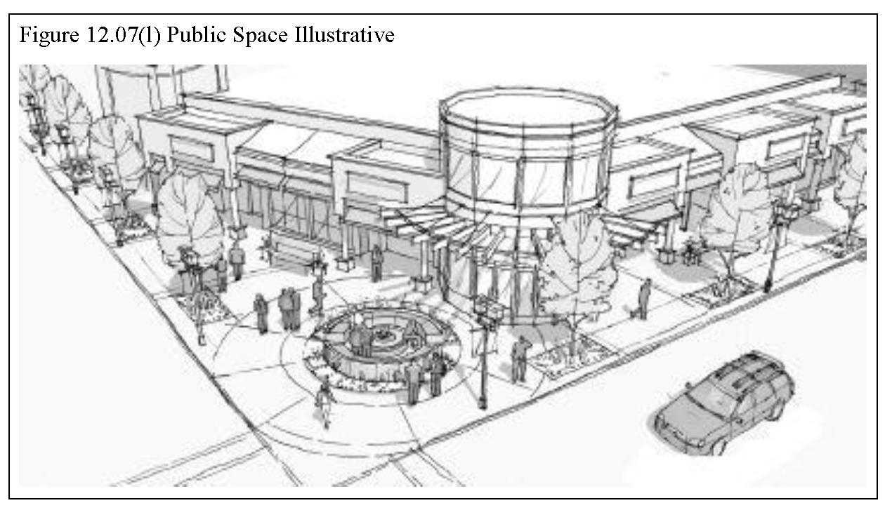 Public Space: Public spaces include open air or unenclosed to semi-unenclosed areas intended for public access and use. These areas range in size and development and serve to complement and connect surrounding land uses. Public space may be publicly- or privately-owned and maintained. (see Figure 12.07(l), Public Space Illustrative)
