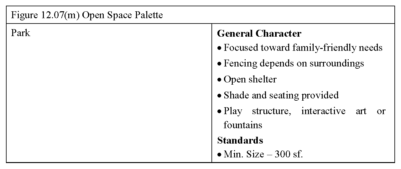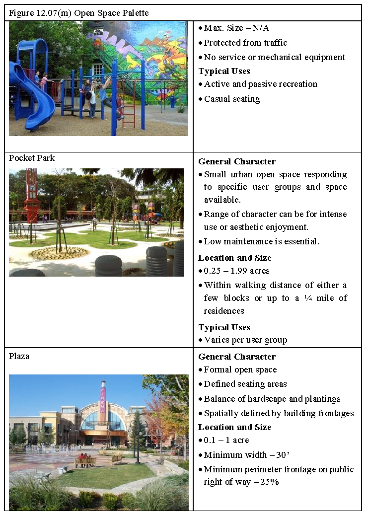 Types of Space. The allowable types of public spaces are displayed in Figure 12.07(g), Open Space Types, and illustrated in Figure 12.07(m), Open Space Palette.