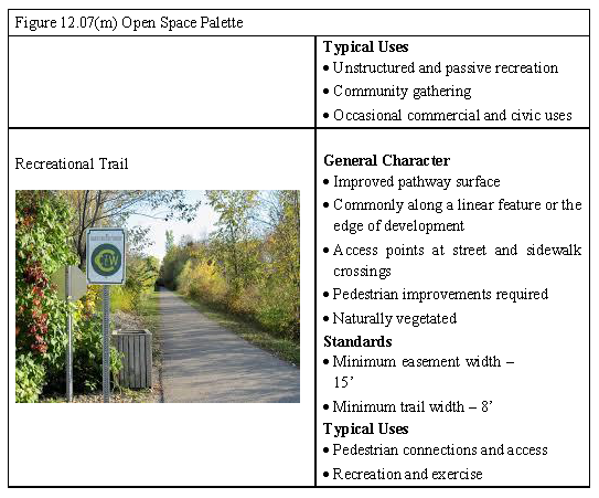 Open Space. As set out in Table 12.07(g), Open Space Types, open space shall be integrated into the overall design of development. Both public and private open space shall be distributed throughout development and should provide not only aesthetic quality but serve recreational and civic functions as well. A variety of open spaces must be conveniently accessible to all residents, employees, and patrons and provide pedestrian linkages throughout the development. Open space must be either include: