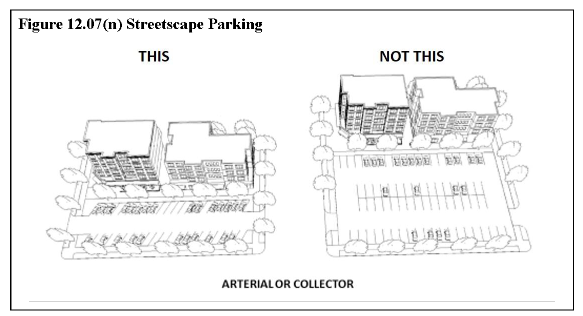 Commercial/Retail. The Enforcement Official may approve a maximum of two rows of parking between buildings and the adjacent street, as displayed in Figure 12.07(n), Streetscape Parking. Otherwise, off-street surface parking shall be located to the side or rear of main buildings. All off-street surface parking lots shall be landscaped to conform to the standards of Section 13.06, Site Design Requirements. Landscape screening shall be planted along 100 percent of all street frontages and other public places. Off-street surface parking shall only be angled or parallel spaces. Each off-street surface parking lot shall not exceed a total of 100 parking spaces, unless otherwise approved by the Board of Zoning Appeals.