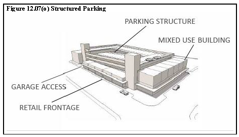 Structured. Parking structures shall be provided to achieve the intended urban form, scale and intensity, density, and mixture of uses of a mixed-use development. To fulfill these requirements, upon initial construction or within an agreed upon time period, structured parking is required for a minimum of 65 percent of the total required parking for a vertical mixed-use building or 50 percent of a horizontal mixed-use development. Parking shall be encapsulated within or below buildings in a manner that conceals it from predominant public view and that does not interrupt the continuity of the pedestrian environment, as displayed by Figure 12.07(o), Structured Parking. All parking structures shall be designed to be consistent with and complimentary to the architectural style of the main building(s). Freestanding parking structures are permitted provided they are either not situated along public streets or they incorporate active ground-level, street-facing uses within the structure. Parking structures shall be positioned within the development to accommodate maximum shared use.