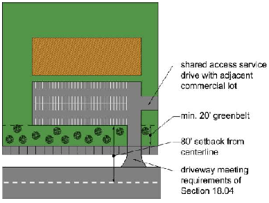 Shared Driveways, Frontage Roads and Service Drives. All uses, except residential and agricultural, shall be required to install service roads to allow connection to adjacent lots that are zoned or planned for non-residential use. Service roads shall generally be parallel or perpendicular to the front lot line. Service roads that are parallel to the roadway corridors may be in the rear or front yard, depending on the location of parking, building setback and appropriate locations for connections to adjacent lots. All service drives shall be designed in accordance with the requirements of Section 18.04.