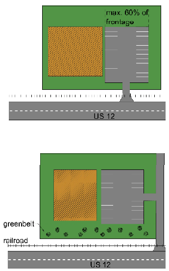 The road frontage greenbelt shall apply to all public road frontages, including limited access highways. The frontage greenbelt requirement shall not apply to private roads that are internal to the site or public roads internal to the overlay district that are developed to provide access to uses within the overlay district and not act as a through roadway.