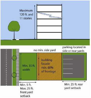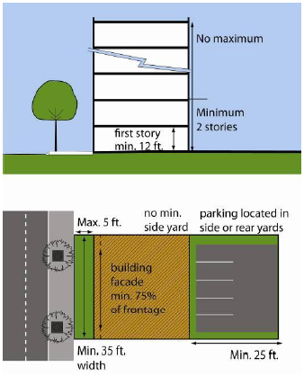 Regulate building height and placement to achieve appropriate scale along streets and critical mass of development to support transit.