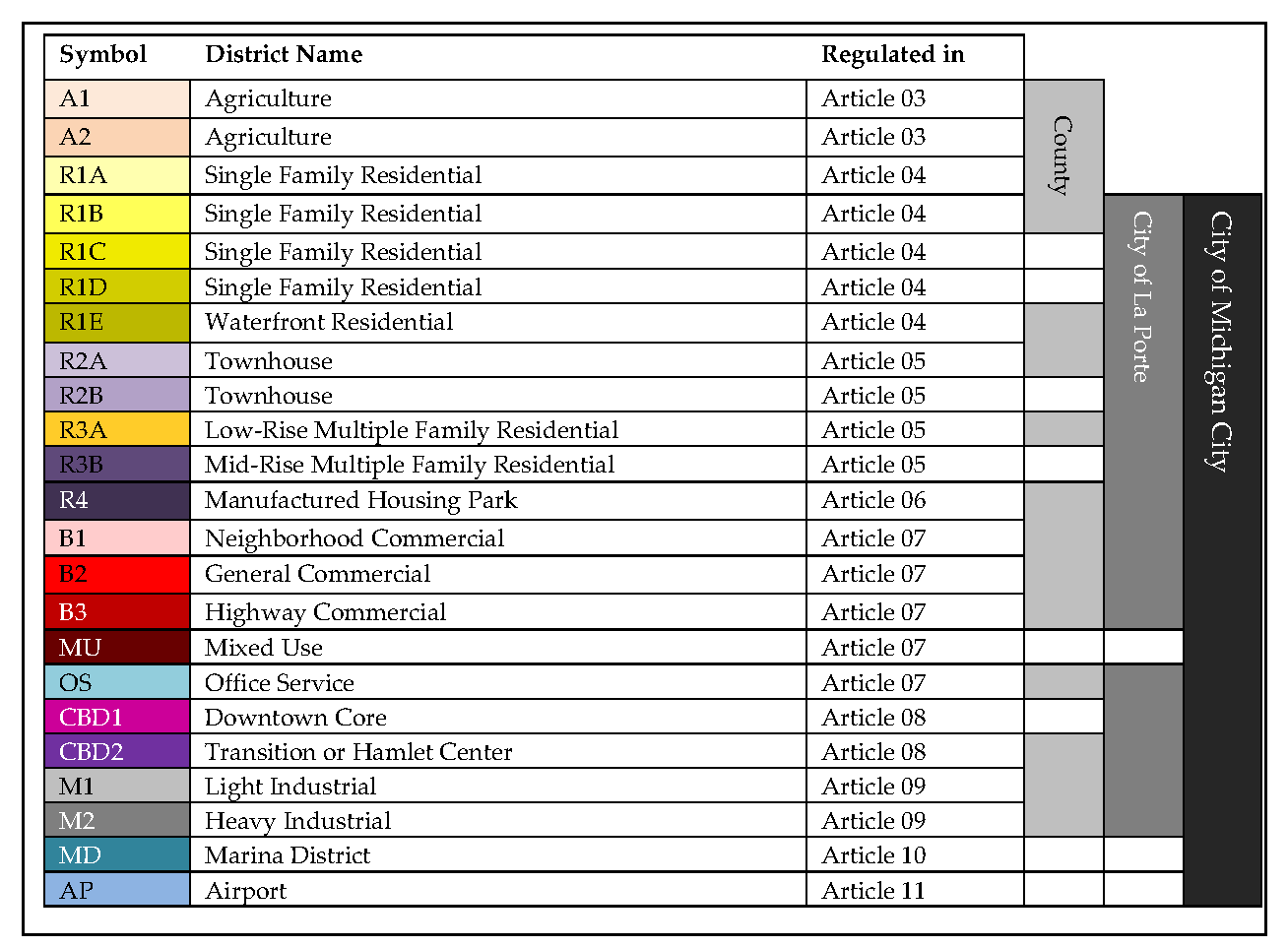 The county of La Porte, including the City of La Porte and the City of Michigan City, is divided into the following Districts. Certain districts are only applicable to the county or cities.