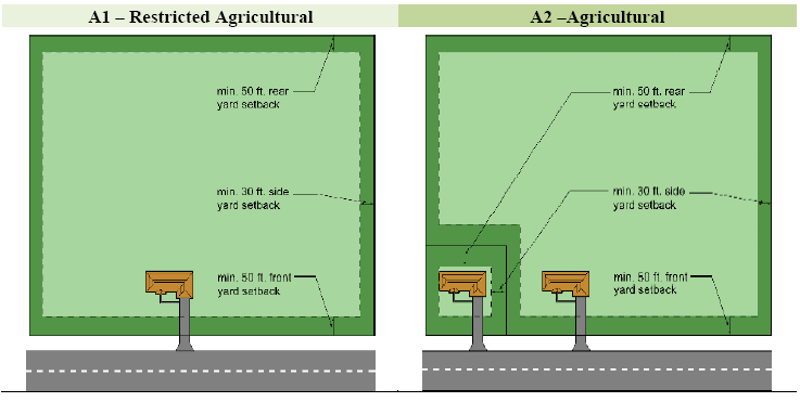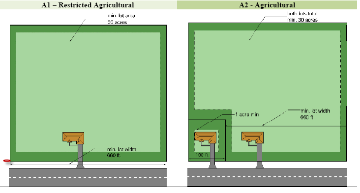 A1 Restricted Agricultural District. The A1 Restricted Agricultural District is established to provide areas of the county for major agricultural operations. The intent of this district is to protect prime agricultural areas from encroachment of residential and commercial sprawl and limit the conflict that can occur between agriculture and residential and commercial development. In order to meet this intent, the district excludes subdivisions and residential developments, other than farmsteads. This district applies to areas of the county designated for traditional agricultural in the County Land Development Plan.