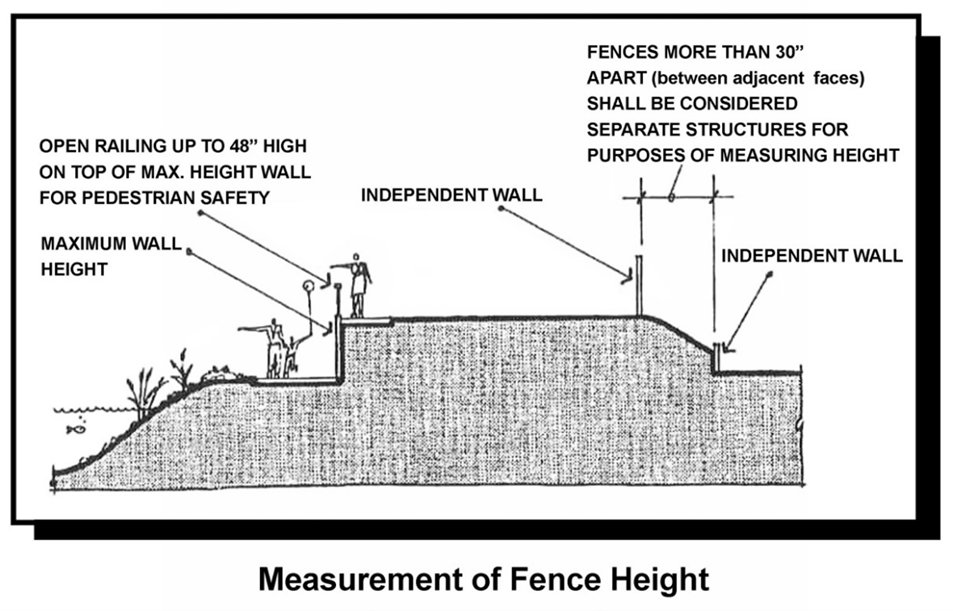 Fences less than thirty (30) inches apart (measured between adjoining faces) shall be considered one (1) structure and fence height shall be measured from the base of the lower fence to the top of the higher fence. Fences thirty (30) inches or more apart shall be considered separate structures and their heights shall be measured independently. The director may require that the area between such fences be provided with permanent landscaping and irrigation.