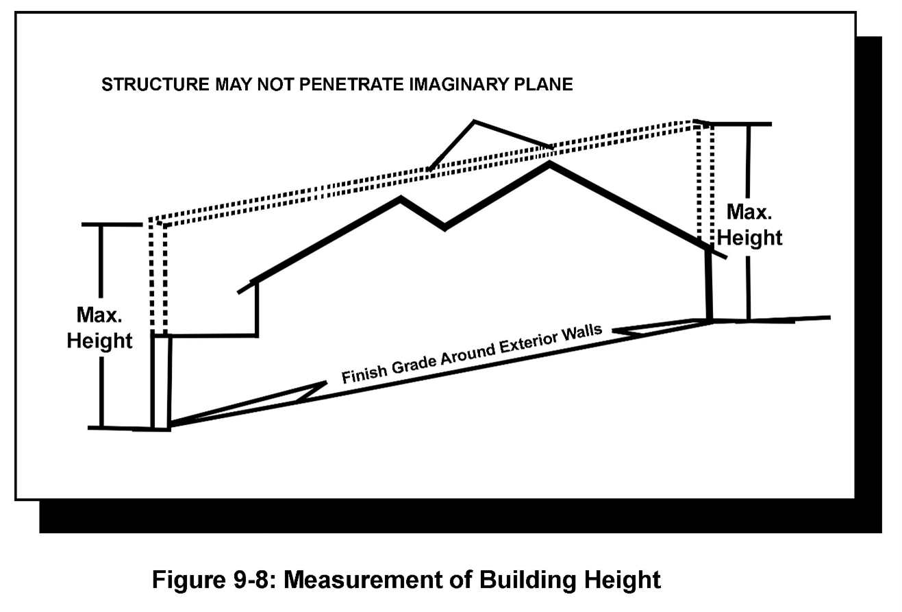 For purposes of this code, the maximum height of buildings and other structures shall be defined as the vertical distance from finish grade to an imaginary plane above the building site. The imaginary plane shall be established above and parallel to the finish grade adjacent to the exterior walls at a vertical distance equal to the specified maximum height. This definition is illustrated below: