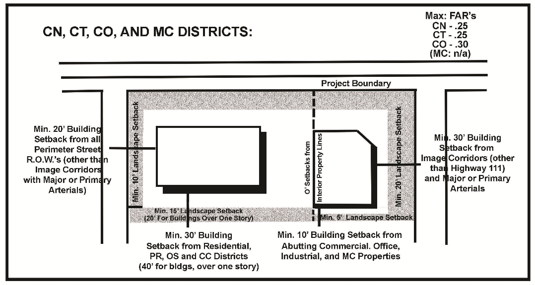 5 For buildings over one story in CN, CT and CO districts, setbacks shall be increased to 40/20.