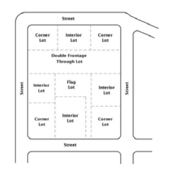 Configuration of lots. Flag lots (i.e., lots with minimal, or panhandle type, frontage) shall not be permitted. Double frontage lots in residential zoning districts shall only be permitted if access is limited to one street frontage. Lots shall be classified based on the following figure: