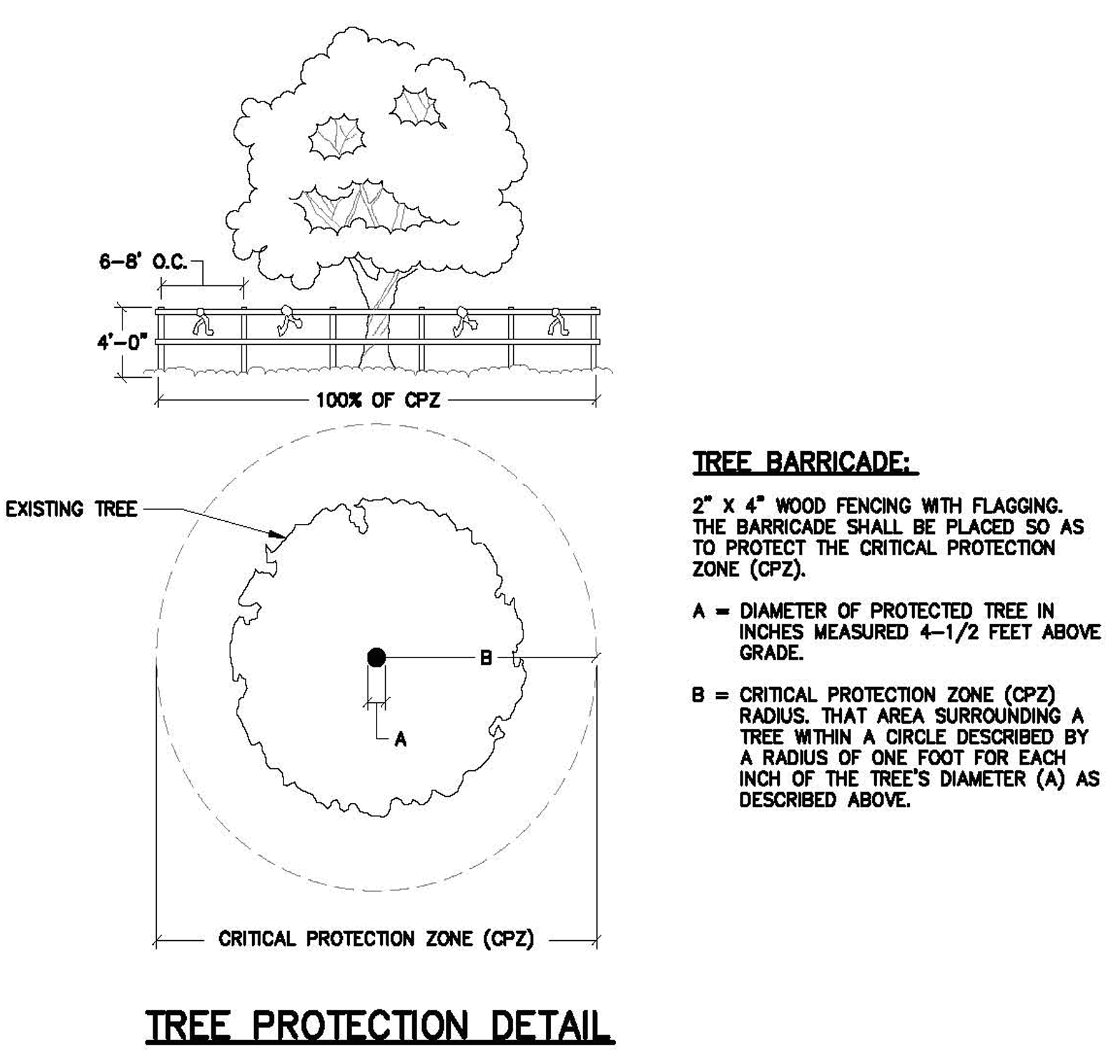 Critical Protection Zone (CPZ). That area surrounding a tree within a circle described by a radius of one (1) foot for each inch of the tree's DBH. (e.g. 12" DBH tree = 12' radius or 24' diameter CPZ).