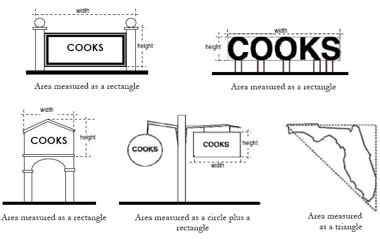 In computing sign area in square feet, standard mathematical formulas for common shapes will be used. Common shapes shall include squares, rectangles, trapezoids, circles and triangles. In the case of irregular shapes, straight lines drawn closest to the extremities of the shape will be used (see graphic below). The total sign area will be the area of the smallest common shape that encompasses the several components of the sign. All words and components of a sign or related message shall be included as one (1) sign. Individual words or components may be considered separate signs only if they are obviously disassociated from other components. When signs are enclosed in a border or highlighted by background graphics, the perimeter of such border or background will be used to compute sign area. Double-faced signs that meet the definition contained in this chapter shall be considered one (1) sign.