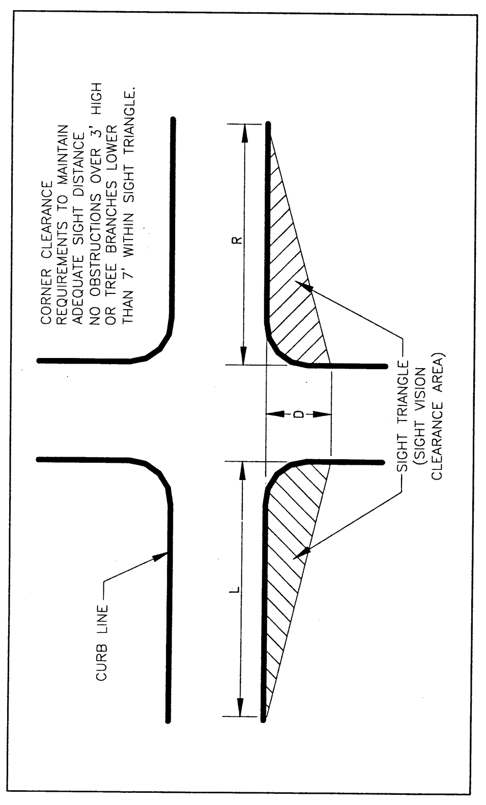 See Figure 14-16 for location of D, L and R distances. All distances are measured from a point where the two (2) curb lines, if extended, or the edge of the roadway if no street curb exists, would intersect.