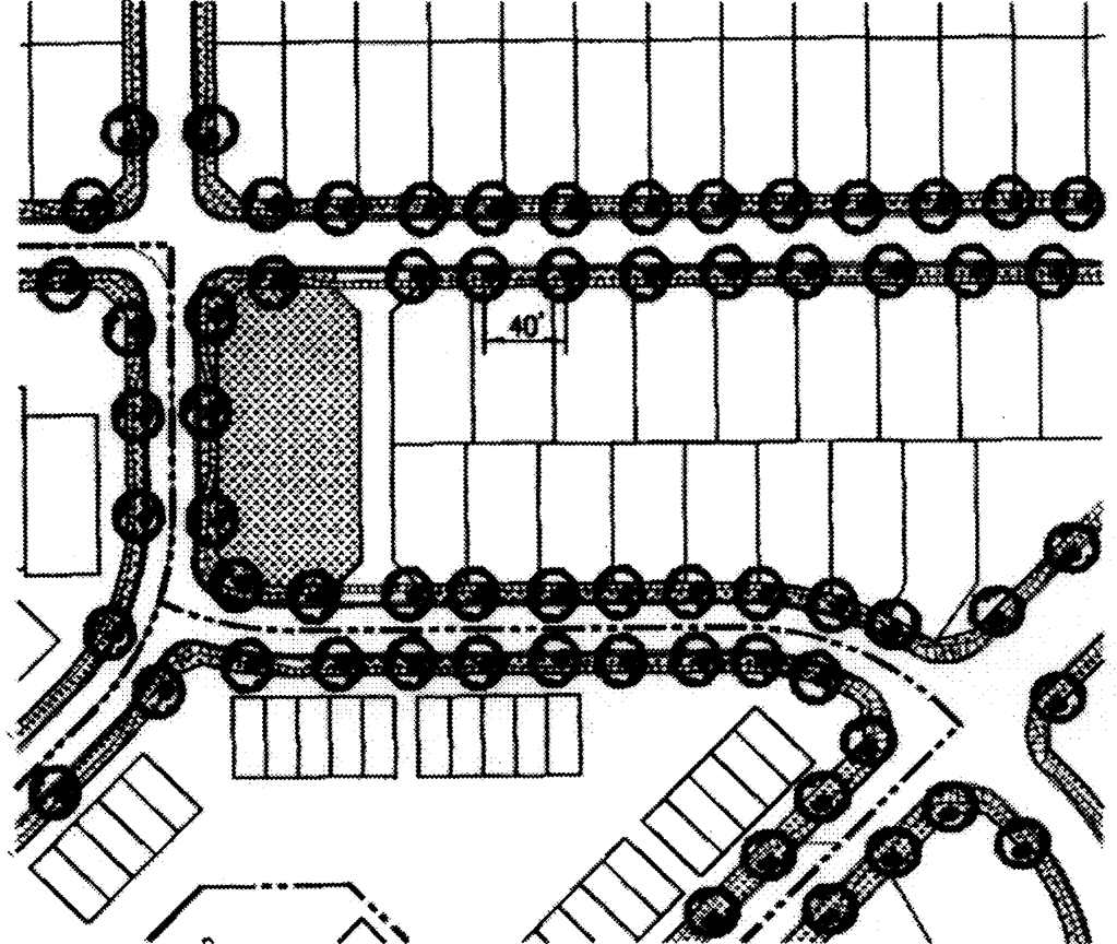 Street trees. Landscape improvements shall create an orderly, irrigated, managed landscape. All neighborhoods shall have tree-lined streets. Street trees shall include a mix of species and be aligned in straight rows. Street trees shall be placed within the right-of-way tree lawn or within ten (10) feet of the back of curb where no tree lawn exists. Trees installed along streets that will be widened in the future, to the extent that such widening is known, shall take into account plans for future widening of streets so that established trees will not be disturbed during future construction.