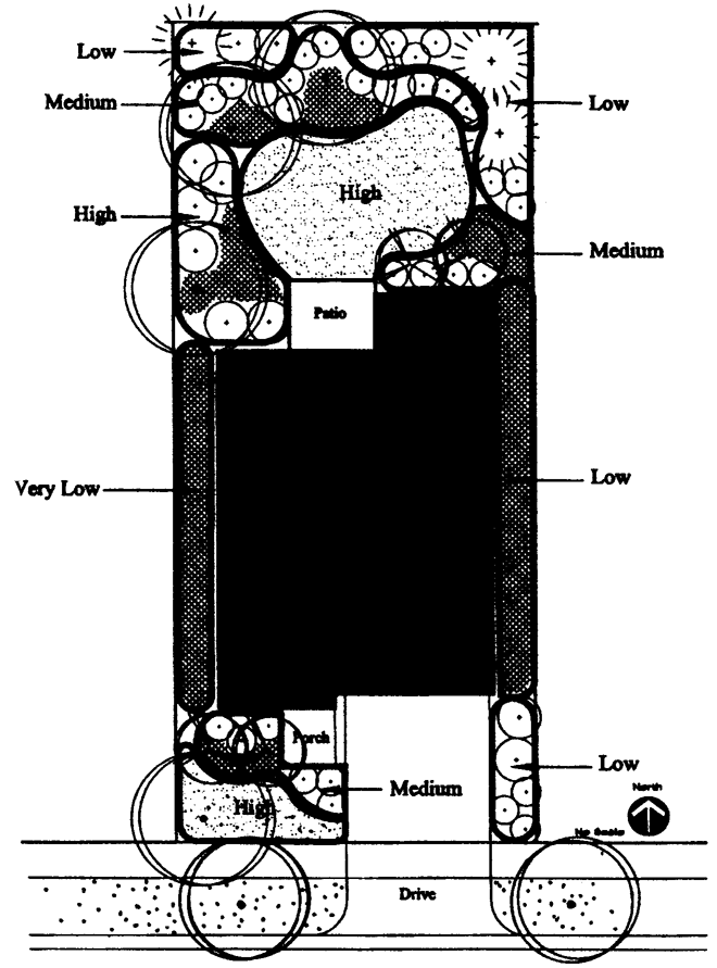 After calculating the irrigation needs of all areas, determine your average overall water needs per season. To do this, add the total gallons needed for all zones, and divide by the total square footage for all zones. The average for the overall site must be no more than 15 gallons per S.F. per season. If your average is more than this, you must modify your planting layout to create more low/very low water zones that would balance your high/moderate water zones, and reduce over-watering.