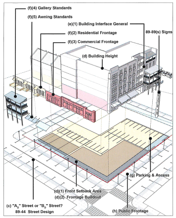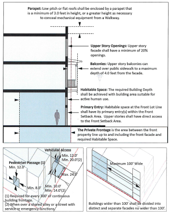 ⇔ Technical standards such as how building height and setbacks are measured, how buildings relate to utility easements, development in required setbacks, and development on substandard rights-of-way, are addressed in article 3.
