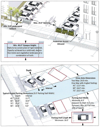 Drive aisle dimensions: Minimum 24.0 feet for two way traffic. One-way drive aisles are allowed only for angled parking (both back-in/head-out and head-in/back-out) with dimensions as follows: