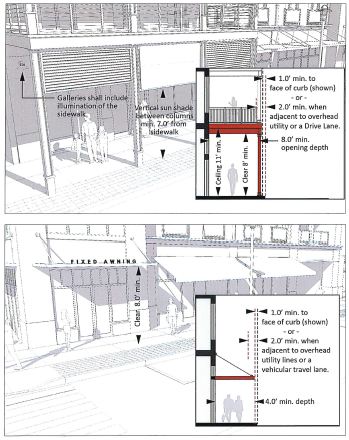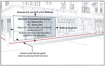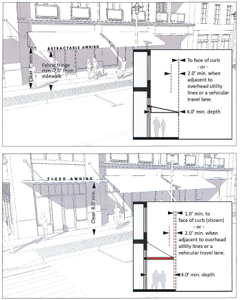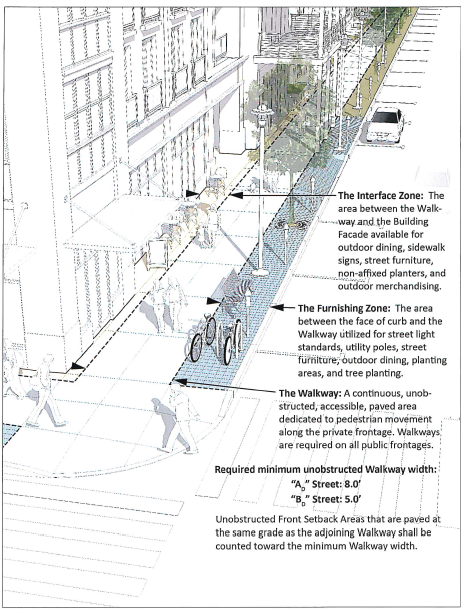 Non-permanent outdoor dining may encroach into an "A D " Street Walkway provided that a minimum 5.0 feet clear is maintained.