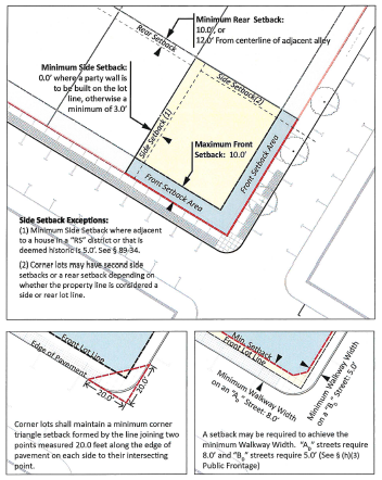 For buildings adjacent to substandard streets, an additional setback may apply (see article 3, section 89-38).