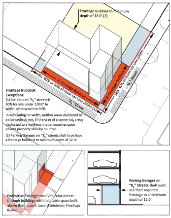 The MN, CM and CH districts include alternative development types, labeled "A" and "B." Development Type "A" provides for urban-type development, with reduced landscaping and parking requirements but increased frontage buildout requirements. Development Type "B" provides for more conventional, suburban-type development, with greater parking, landscaping and green infrastructure requirements to accommodate vehicular access and to mitigate the impacts of paved surfaces and buildings. The following criteria determine whether an application is required to use Development Type "A" or "B":