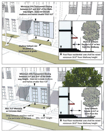 The walkway: A continuous, unobstructed, accessible, paved area dedicated to pedestrian movement along the private frontage. Walkways are required on all public frontages.