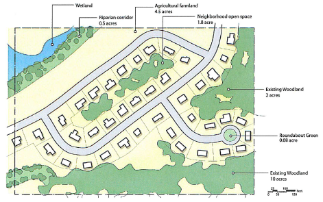 Purpose: a conservation subdivision is a development option that preserves agricultural land, natural resources, and rural character. The standards provide for low development impacts, while providing design flexibility and eliminating standards that would require unnecessary consumption of land. The site characteristics conserve important site features such as open space networks and contiguous woodland habitats adjacent to other existing open space tracts. The site design should encourage connectivity between environmental characteristics of adjacent properties and provide a continuous open space network between the proposed development layout and the adjacent properties. Intermodal trails which provide a link to adjacent properties as an enhancement of recreational opportunities are encouraged. Because the development standards are flexible, development costs per lot are significantly lower than conventional options, and lot yield is typically higher. Conservation street designs are provided in article 3 of this chapter.