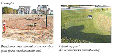 Dry ponds with associated steep slopes, dams, mowed areas, fencing or unsightly overflow structures do not count toward the required conservation area.