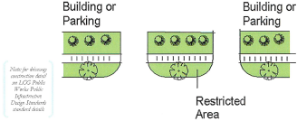 The area between driveways and on either side of the driveway shall remain unimproved for vehicular travel or parking. This area shall be considered restricted and may be filled only with sidewalks, landscaping, or stormwater facilities (as provided in subsection d, below). If a curb exists on the roadway, a permanent separation (i.e. 6" curb) from the roadway shall be present.