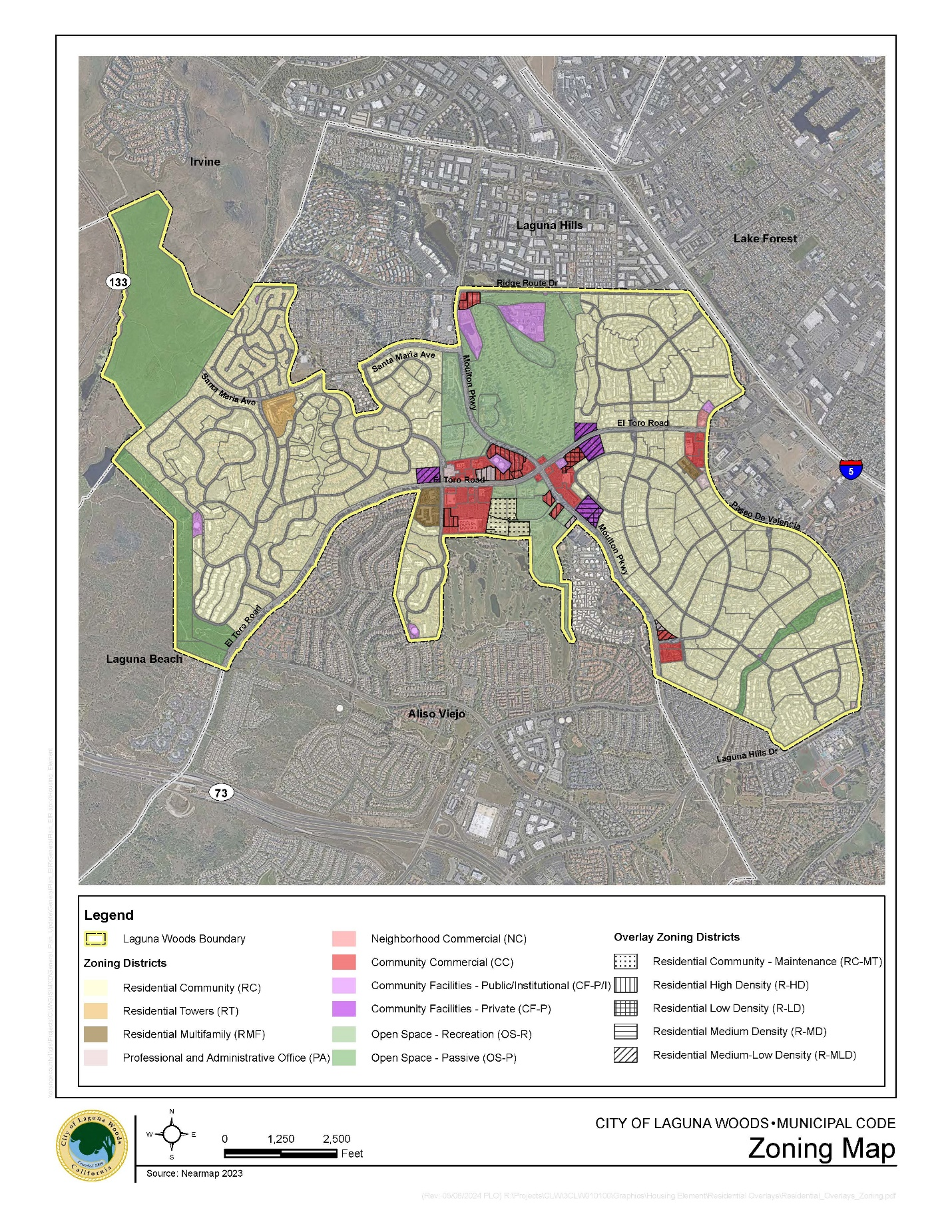 The incorporated territory of the City of Laguna Woods is hereby divided into zones or districts, as set forth in this title, as determined and defined by officially adopted zoning map. The zoning district map showing the classifications and boundaries of the districts shall, upon adoption in the manner required by the Planning and Zoning Law, be a part of this chapter. The following districts are established: