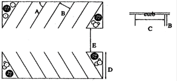 | Angle (A) | Width (B)a | Curb Length (C) | Stall Depth (D)b | 1 Way Aisle Width (E) | 2-Way Aisle Width (E) |